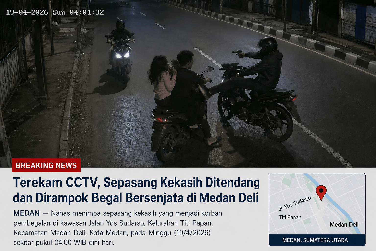 MEDAN — Nahas menimpa sepasang kekasih yang menjadi korban pembegalan di kawasan Jalan Yos Sudarso, Kelurahan Titi Papan, Kecamatan Medan Deli, Kota Medan, pada Minggu (19/4/2026) sekitar pukul 04.00 WIB dini hari. Dua pemuda bersenjata tajam berhasil merampas sepeda motor milik korban. Seluruh aksi begal itu terekam jelas oleh kamera CCTV milik warga di lokasi kejadian.